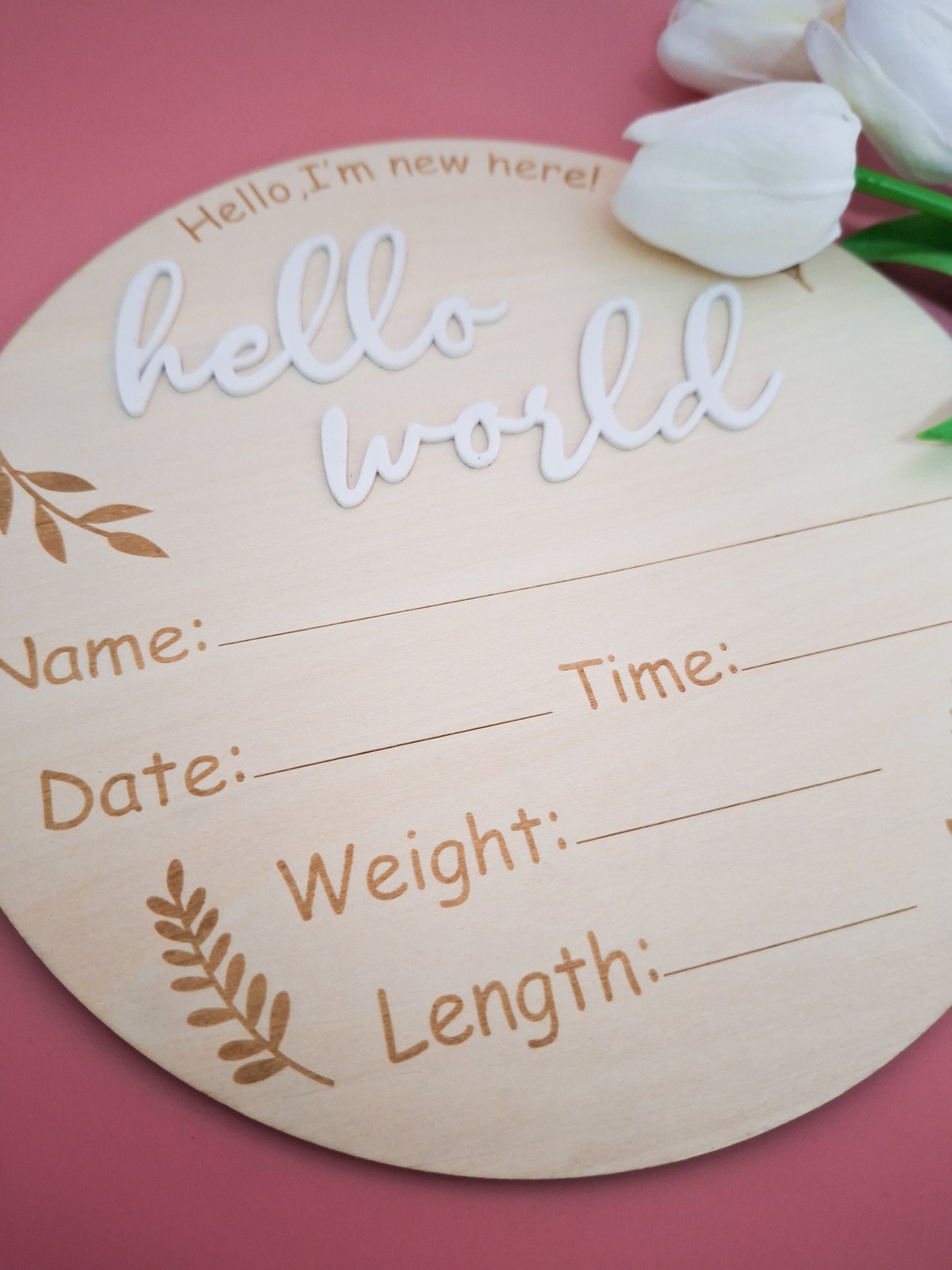 Welcome your little one in style with our Hello World birth announcement plaque! 🌿 Crafted from wood, this 20cm round keepsake has space to write your baby’s name, date, time, weight, and lenght — perfect for those first precious photos and memories.